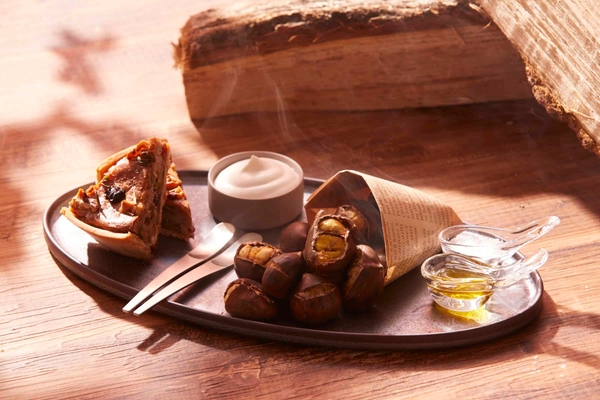 イタリアでは焼き栗の屋台が並ぶ風景が、秋の風物詩として親しまれています。当施設がイタリアの山岳都市をイメージして建てられたことから、ワインの新酒に合わせるおつまみも、焼き栗と栗粉を使った焼き菓子を用意しました。手軽につまめる焼き栗と、同じくイタリアのトスカーナ地方の、栗粉を使った伝統的な焼き菓子「カスタニャッチョ」を、リゾナーレ八ヶ岳風にアレンジした「トルタ・ディ・カスタニャッチョ」をセットで提供します。カスタニャッチョは、中は栗粉の生地がしっとりと、外はサクサクとしたタルト生地が焼き上がり、ナッツの食感やローズマリーの風味もアクセントになっています。トッピングのオリーブオイルや塩は焼き栗に、甘口のワインを混ぜた生クリームはカスタニャッチョにつけて食べるのもおすすめです。ほのかな甘みの焼き栗と焼き菓子のセットは、フレッシュなワインの新酒とのマリアージュにぴったりです。