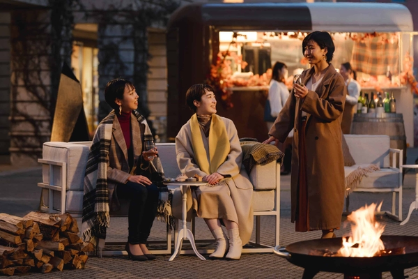 「焚火ワインサロン」は、メインストリート「ピーマン通り」にオープンします。焚火を囲んで炎の揺らぎを眺めながら、ゆったりと過ごせる空間です。焚火の周りにはソファが並び、クッションやブランケットも用意します。秋の午後に、焚火で温まりながらリラックスしてワインを楽しむひとときを過ごせます。