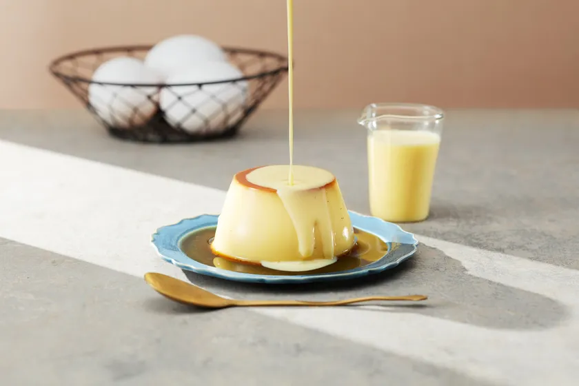 なつかしさを感じるしっかり食感のプリンに、甘く香ばしいカラメルソース。たまごをもっと味わってほくしくて、後がけのソース「スープアングレーズ」で仕上げました。