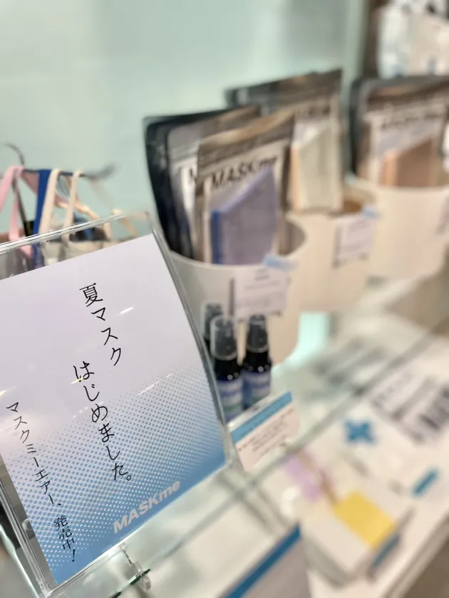 巨大なアイスクリームカップが、夏マスクの涼しさをアピールします。涼しさのポイントは、風通しのよさ。マスクミーはメッシュやオーガンジーなどの通気性に特化した素材を使用しています。見た目にも涼しいシャーベットカラーや透明感のあるカラーなど、涼しく過ごすための工夫が施されています。店頭に並ぶ夏マスクの数は50種類にも及びます。老若男女どなたでも、この夏に愛用出来るものが見つかります。