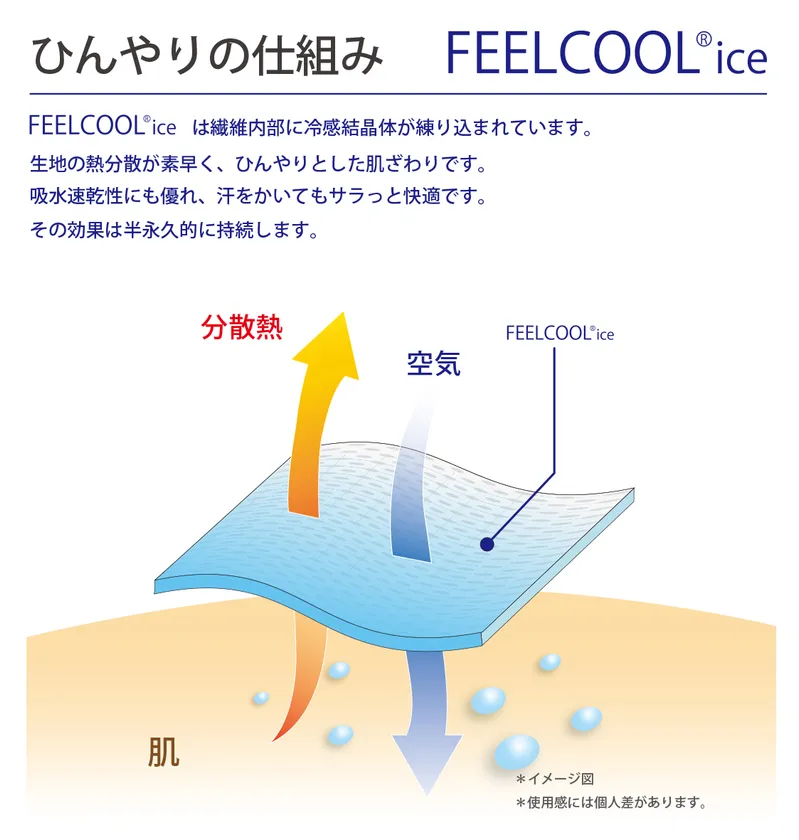 FEELCOOL(R) iceは繊維内部に冷感結晶体が練りこまれており、生地の熱分散が早くひんやりとした肌ざわりです。吸水速乾性にも優れていて、汗をかいてもサラッと快適!しかも効果は半永久的に持続します。