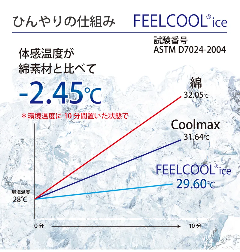 一番の特徴は生地検査機関が認めたホンモノの冷感素材「FEELCOOL(R) ice」です。