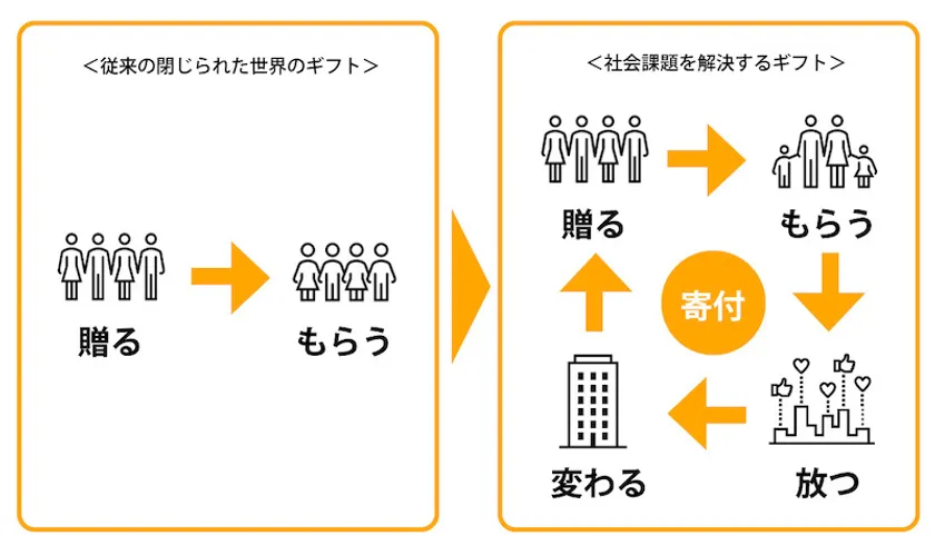 大日本印刷(DNP)が発表した「日常生活とギフトの実施状況に関する調査」(2016・2017年)によると、こどもの成長やお祝い事などライフステージの変化のタイミングで贈られる「ライフイベントギフト」の市場規模は3兆1,500億円。このうち“たった1%”が本ギフトのような「体験型・寄付型ギフト」に変わるだけで、約300億円の新たな寄付活動が生まれます。仮に300億円が社会貢献活動を行う1,000団体に寄付されたとすれば、1団体あたり約3,000万円の収入が生まれることとなり、数々の志の具現化につながることとなります。