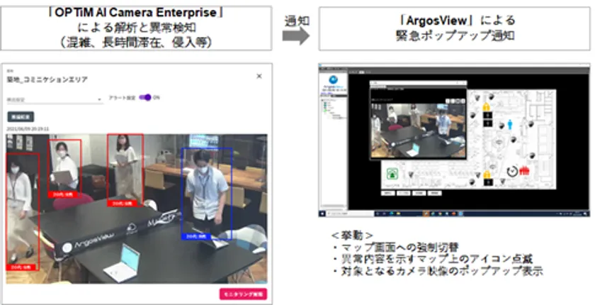 ●特長2:「OPTiM AI Camera Enterprise」による異常検知を「ArgosView」監視画面に瞬時に通知