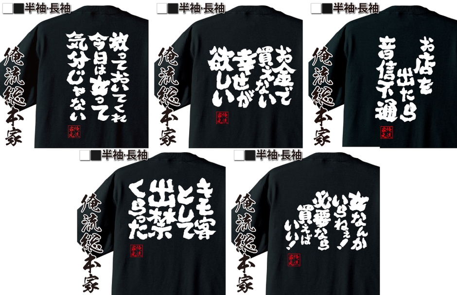 俺流総本家の語録Tシャツは、1万種類以上のデザインを取り揃えています。面白いものから感動的なものまで、多彩なデザインがあり、お客様一人ひとりの個性を引き立てる一枚を見つけることができます。カスタマイズ可能なデザインもあり、特別なイベントやギフトにも最適です。