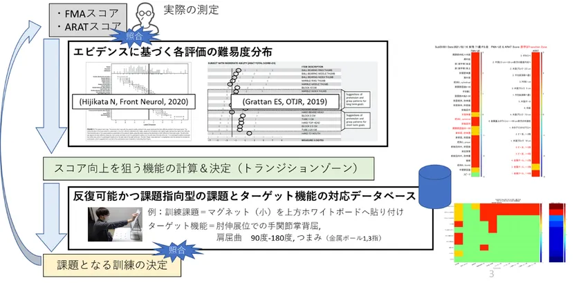 ユーザーの運動機能をFMA-UE・ARATで評価。そのスコアから、エビデンス(*5)(*6)(*7)に基づき「該当ユーザーがギリギリ達成できない難易度の運動」を特定。多様な「訓練」内容を定量的に格納したデータベースと照合し、「該当ユーザーにとってターゲットとなる運動機能の最も効果的な訓練」を推定し推奨。セラピストが推奨度を見ながら複数の訓練を実施(図2)した。