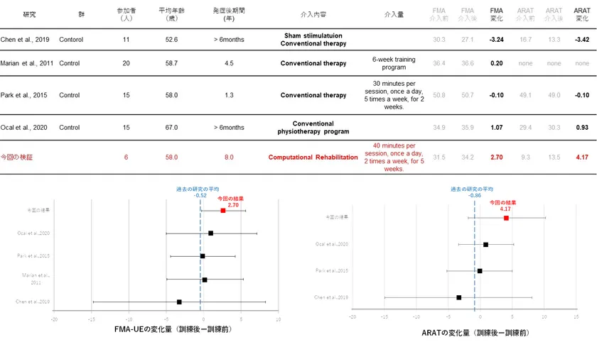“コンピューテーショナルリハビリテーション”=患者一人一人の状態に基づいた個別化されたリハビリ内容の提案を行った結果、FMA-UEは、検証前31.5→検証後34.2と改善し、ARATに関しても検証前9.3→検証後13.5と改善しました。