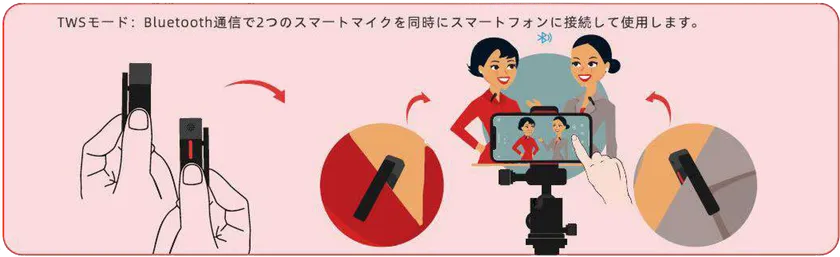 2. TWSモード:インタビューやライブ、演奏など同時録音(スマートマイク+を2個使用)