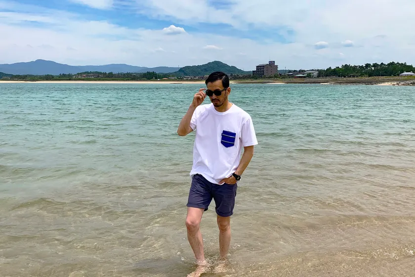 Tシャツは光沢のある手織りポケットが映えるように、コットン厚め生地を採用。ポケットは「ネクタイのようにいろいろな場面で楽しんでいただきたい」というコンセプトからボタンを付けて取り外し交換可能にしました。