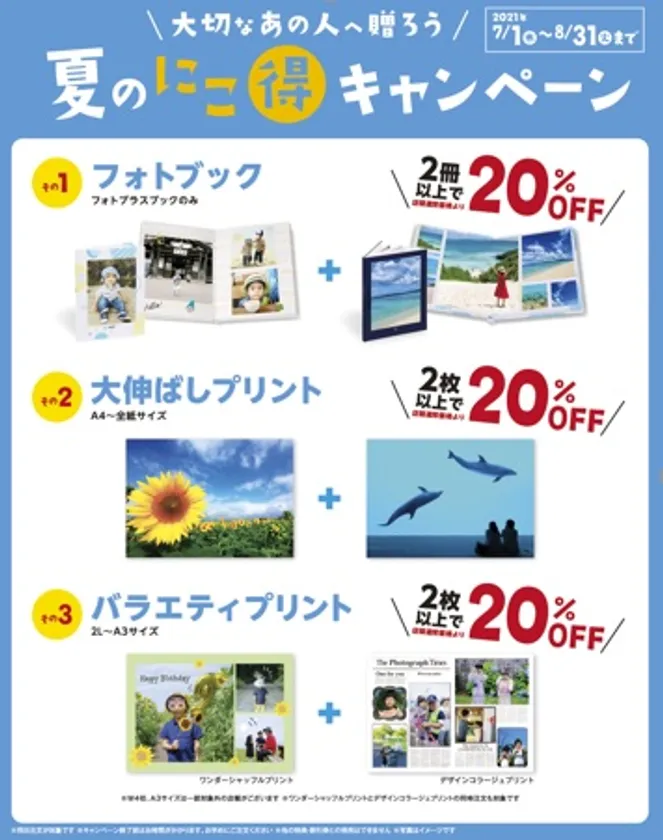 株式会社キタムラ(代表取締役社長:浜田 宏幸)は、7月1日(木)~8月31日(火)にかけて全国に展開するカメラのキタムラで、なかなか会えないこのご時世に、写真を「大切なあの人に贈ろう」という思いを込めて、複数注文が安くなる「にこ得」キャンペーンを実施いたします。
