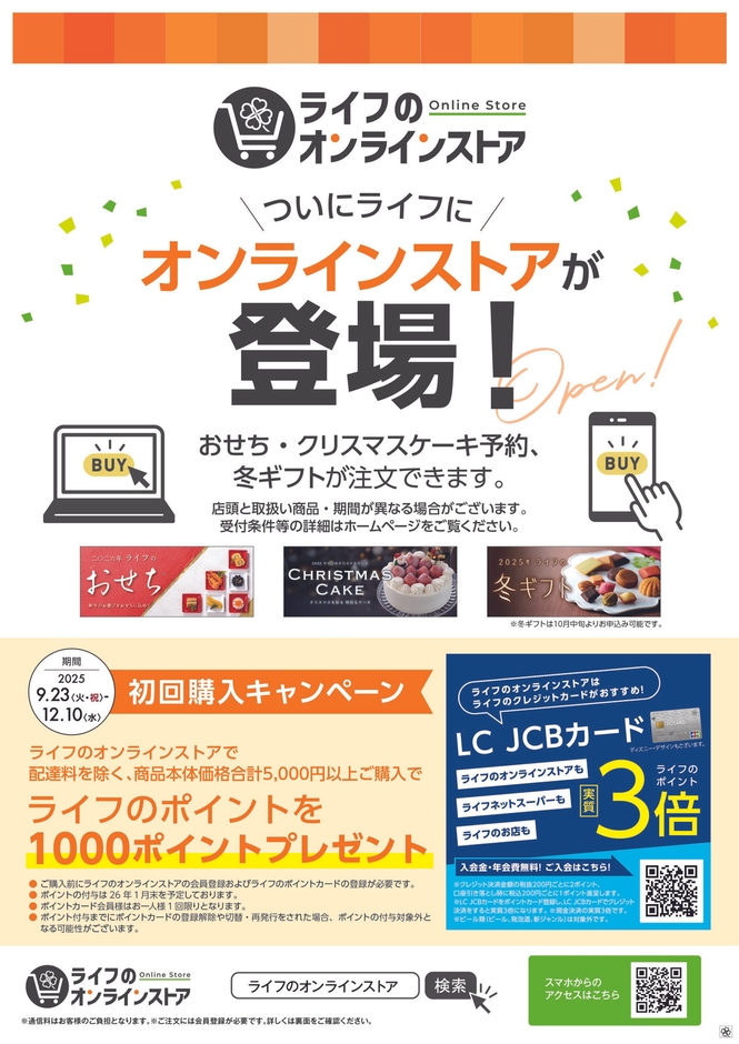 パソコンやスマートフォンから、おせち・クリスマスケーキ・ギフト各種をご注文いただける「ライフのオンラインストア」が誕生!