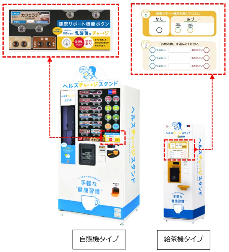 人々の健康維持・増進への行動を促すことを目的に、アペックスが運営する約4万台のカップ式自動販売機を対象に、「シールド乳酸菌(R)」入りのコーヒーやココアなどの飲料を販売します。同時に、ボタンひとつで全ての飲料に「シールド乳酸菌(R)」を加えることができる新機種「ヘルスチャージスタンド」の展開を進めていきます。