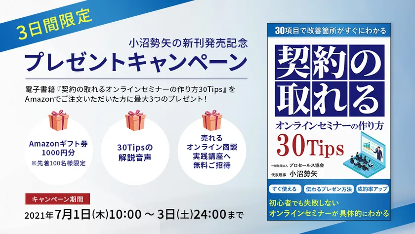 一般社団法人プロセールス協会(所在地:東京都大田区、代表理事:小沼 勢矢)は、当協会代表である小沼 勢矢がオンラインセミナーを主催される方々向けのノウハウをまとめた電子書籍の新刊『契約の取れるオンラインセミナーの作り方30Tips』を発売します。またこちらの新刊発売を記念して、Amazonにてご購入された方向けの企画として7月1日から7月3日までの3日間限定で3つの特典をプレゼントするキャンペーンを実施すると共にこの期間限定特別価格として99円にて販売いたします。