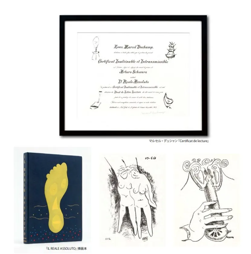 そのうち写真家であり友好関係のあったマン・レイとの共作である、LOT64「IL REALE ASSOLUTO」(挿画本)はデュシャンに関する著作を多く残してきたイタリア人美術史家アルトゥーロ・シュワルツの著書に作家2名によるリトグラフ版画が収められた作品です。