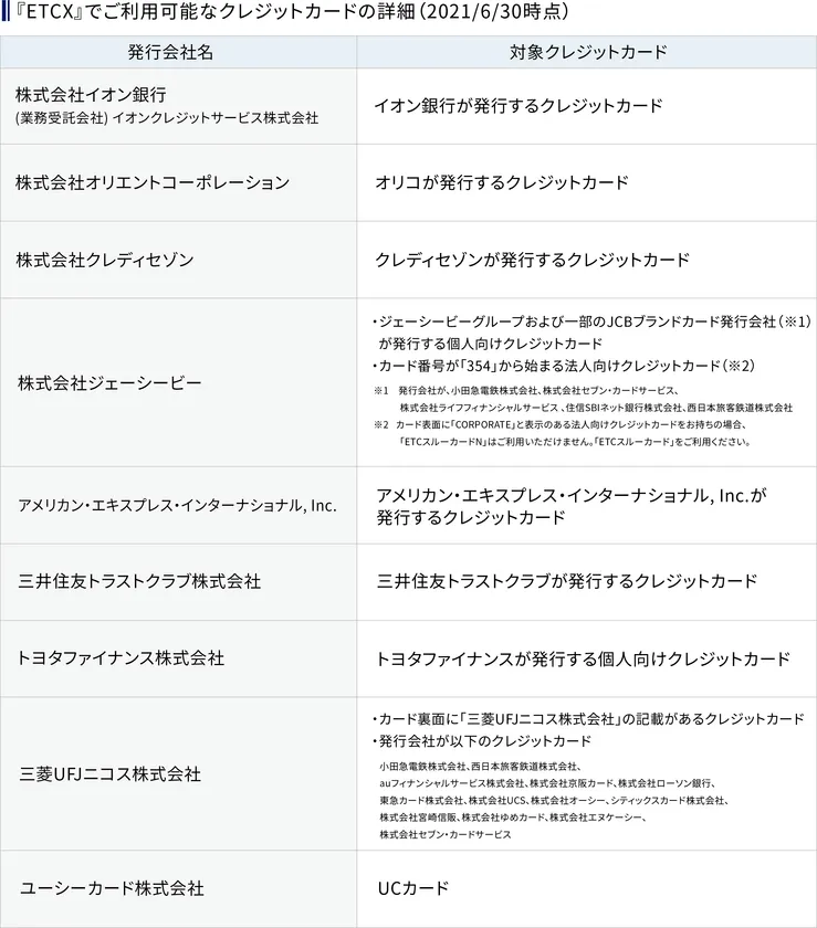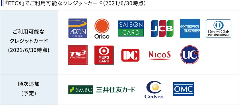 ご利用可能なクレジットカードの詳細につきましては、『ETCX』サービスサイト内「ご利用可能カード一覧」( https://etcx.jp/cardlist )をご確認ください。