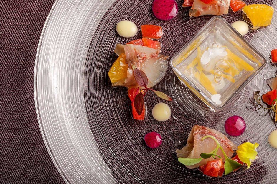 ・旬魚のカルパッチョと高糖度トマト 旬の柑橘のフレーバー