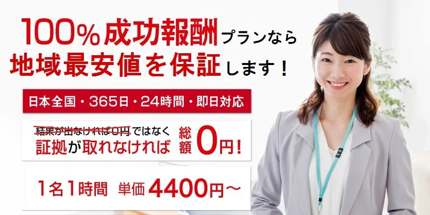 大阪府・東京都内でのエリア限定で、同業他社である探偵・興信所の100%成功報酬制プラン(完全成功報酬制)の浮気調査見積書を提示していただければ、その見積り額よりも安い料金で調査を行う事を保証するサービスです。