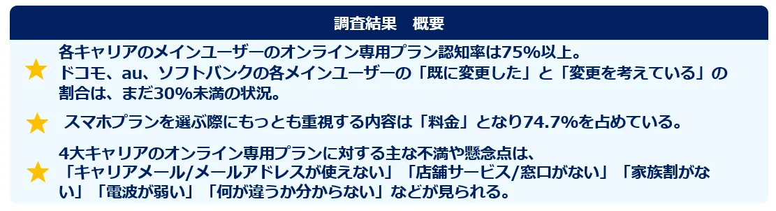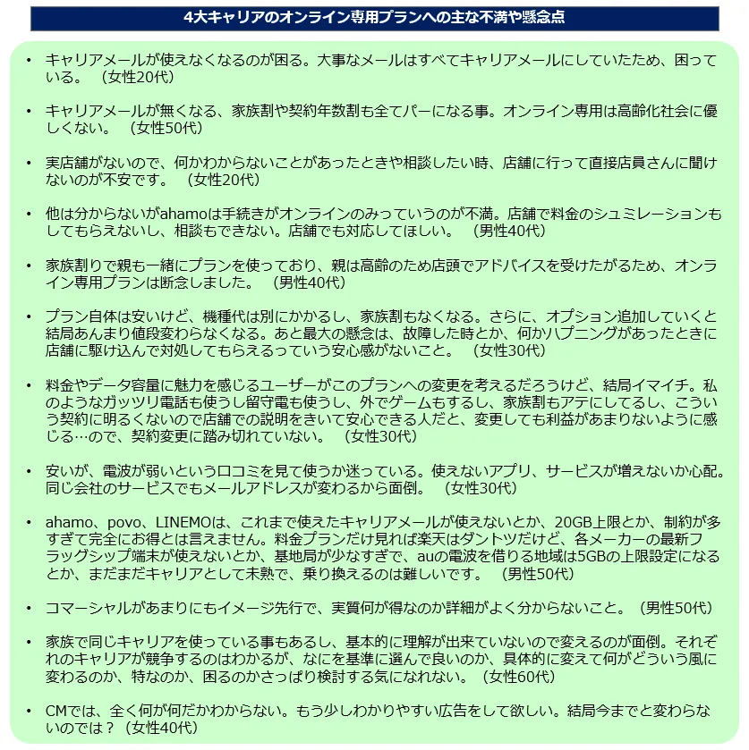 4大キャリアのオンライン専用プランに対する主な不満や懸念点は、 「キャリアメール/メールアドレスが使えない」「店舗サービス/窓口がない」「家族割がない」「電波が弱い」「何が違うか分からない」などが見られる。 ーインサイトテック ユーザーアンケートー