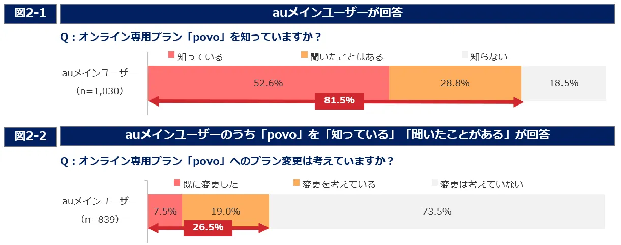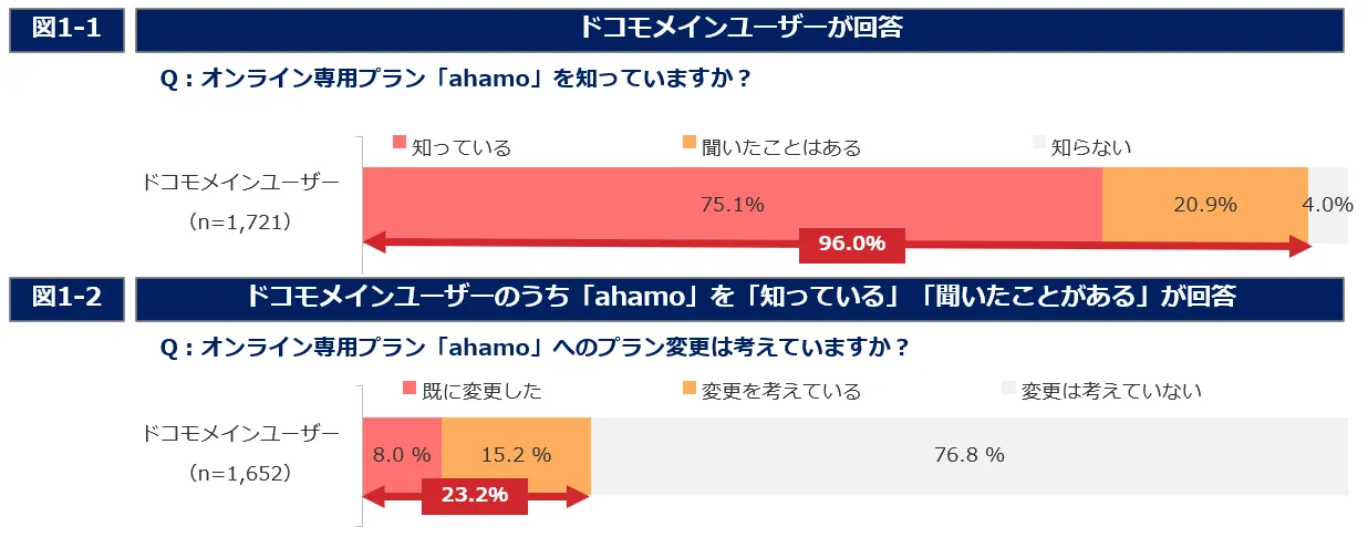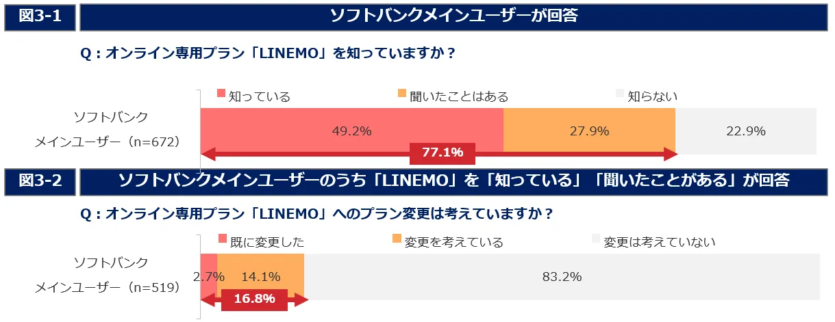 【図1〜図4】各キャリアのメインユーザーに、それぞれのオンライン専用プランの認知とプラン変更について質問。
