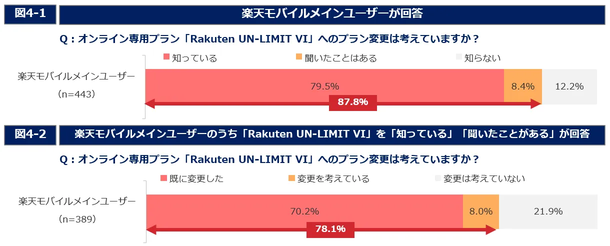 ・楽天モバイルのメインユーザーは、契約プランによって「RakutenUN-LIMIT VI」に自動で変更する内容や1年間基本料金無料キャンペーンなどもあり、「既に変更した」が78.1%と高い割合となっています。