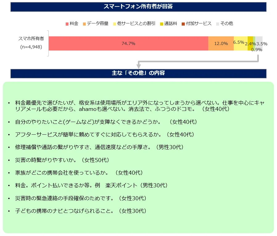 ・「その他」について、その内容を確認すると「キャリア決済が出来る店が多いこと」「海外での使い勝手が良いこと」「電波のカバーエリアの広さ」「メールアドレスの変更がないこと」「ゲームや音楽、映像の見易さ」「アフターサービスが良いこと」「災害時に繋がること」など、スマートフォンが決済手段や連絡手段、海外での利用、余暇や趣味での利用など、日常生活の重要な役割を担っている為、より使いやすいこと、プラン変更時に手間がないことなどが重視されていることが分かります。