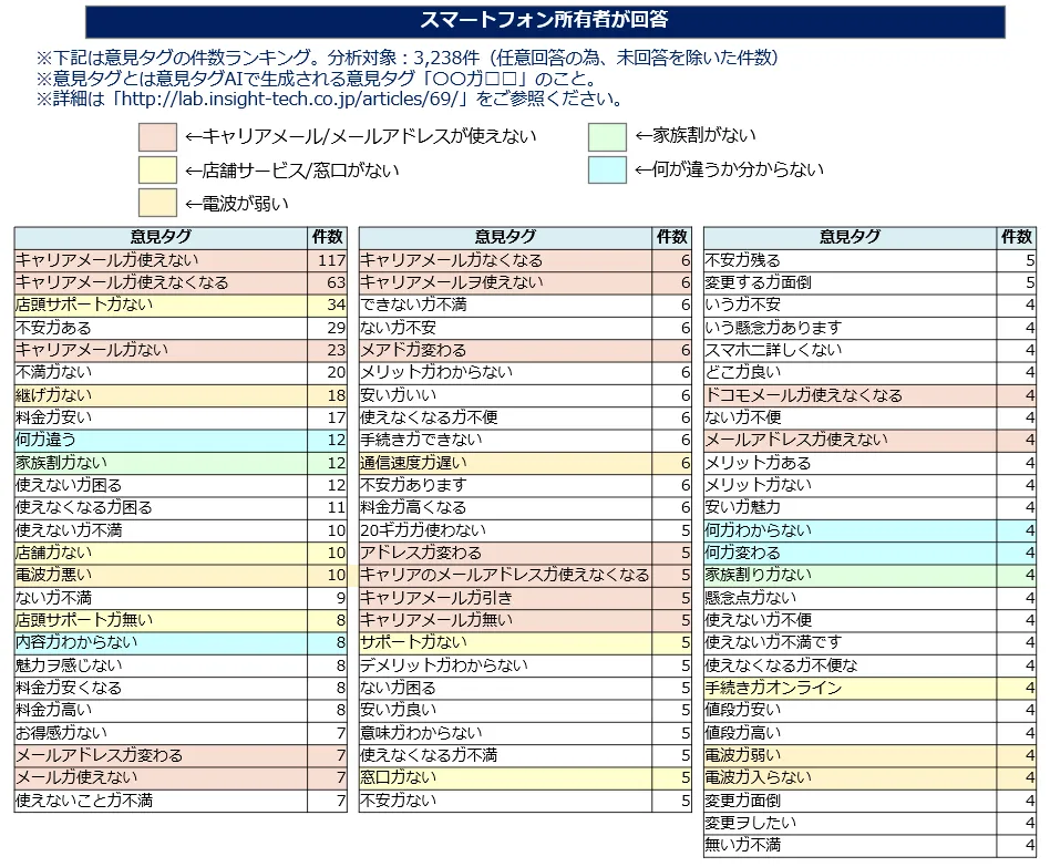 ・「キャリアメール/メールアドレスが使えない」では、「様々なサービスがスマホで手続き、登録をしているから、使えないと困る」といった不満が見られました。