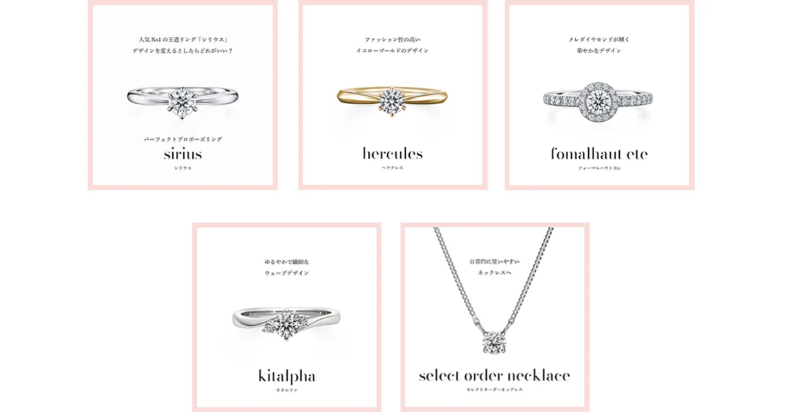 パーフェクトプロポーズリングでプロポーズされた後、どんなデザインに変更したいか、または贈られた人気リング「シリウス」をそのまま大切にしたいのか、あなたのスタイルに合わせて5つの画像の中からお気に入りを選んで投稿してください。厳正なる審査の上、投稿の中から抽選で3名の方に肌の露出が増える夏にぴったりな「ダイヤモンドネックレス」をプレゼントいたします。ぜひ、この機会にご応募ください。