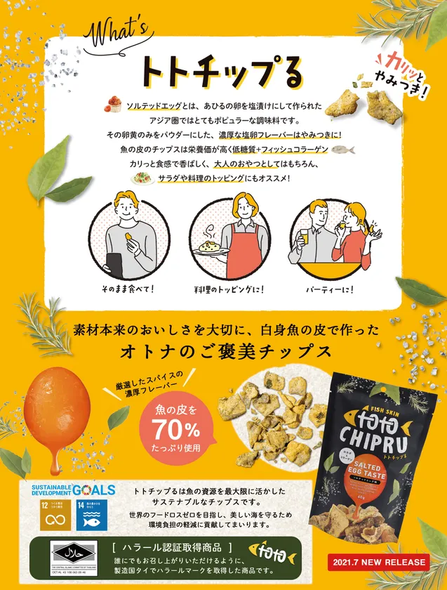 株式会社エスグロー(本社:神戸市中央区、代表取締役:瀬川 雅矢)は、「魚の皮で作ったオトナのご褒美チップス トトチップる」を、2021年7月1日(木)より販売開始しました。