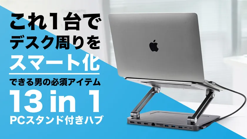 現代のワークスタイルに合わせハイスペックな13ものポートを完備し、ハブとしての理想を形にしました。コード類でいっぱいのデスク上もスッキリと整頓され効率的に作業が行え、仕事の効率化をサポートします。また、100W電源供給も可能なため、出先でのスマホ使用をしながらの作業時に充電切れの不安も解消します。