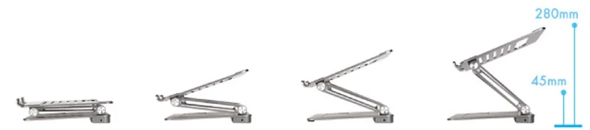 【Z HUB】は自由自在に様々な角度に調整することが可能です。人間工学に基づいたタイピングを実現し、最大280mmまで高さを出すことができるので、タブレットを使ってのペン作業からサブモニターとの高さの均一化まで幅広くお使いいただけ、作業時の疲労を軽減します。頑丈な構造をしていることによりタイピング時のグラつきを軽減し、より効率のよい作業をサポートします。