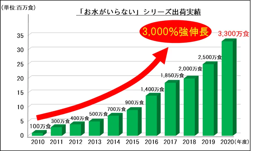 「お水がいらない」シリーズは、2020年度の年間販売数が3,300万食に達し、発売から10年で3,000%強の伸び率となりました。また、シリーズ累計販売数1億3千万食を突破いたしました。これからも、皆様にご愛顧いただける商品づくりを心掛けて参ります。