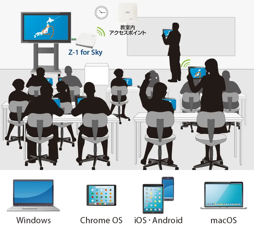 『Z-1 for Sky』は、全国の小中学校に配備されている様々な端末環境(Windows、macOS、iOS、Android、Chrome OS)からの画面投影に対応しており、授業の円滑化を実現します。投影のためのソフトウェアのインストールは不要で、投影画面の切り替えに専用デバイスも不要であることから、準備に時間を取られることもなく授業を開始できます。