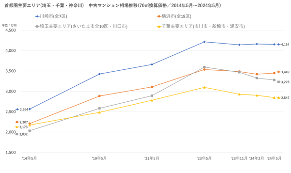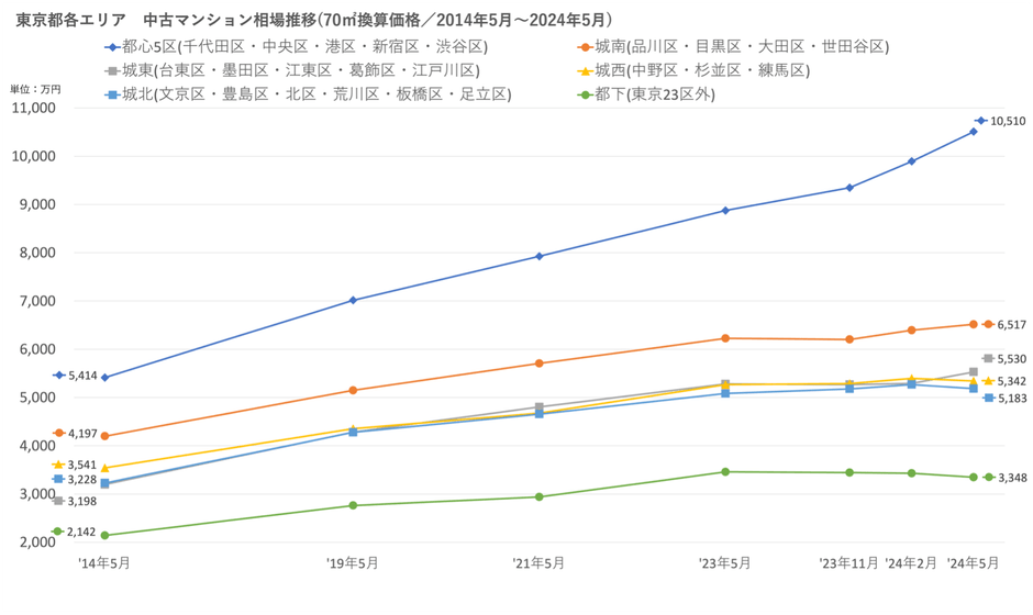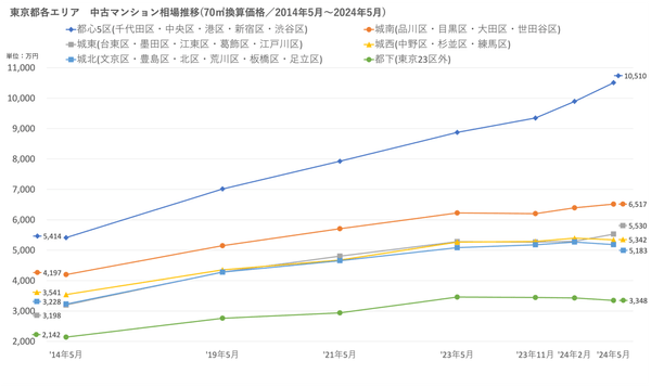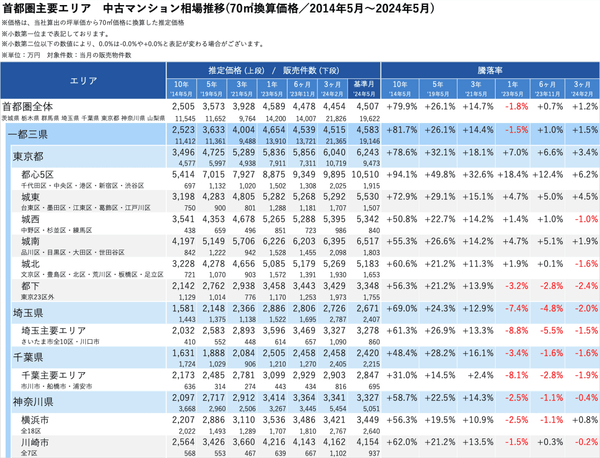 「不動産×WEB×ビッグデータ」の領域で、さまざまな不動産テックサービスを展開する株式会社ワンノブアカインド(本社:東京都港区、代表取締役社長:川島 直也、以下当社)は、当社が運営しているマンション情報サイト「マンションレビュー」の保有データを元に、全国の2024年5月の中古マンション相場を調査。坪単価をベースに70㎡での価格に換算した「中古マンション価格」*1について、10年前・5年前・3年前・前年からの推移を都道府県別・エリアごとにまとめましたので、発表いたします。