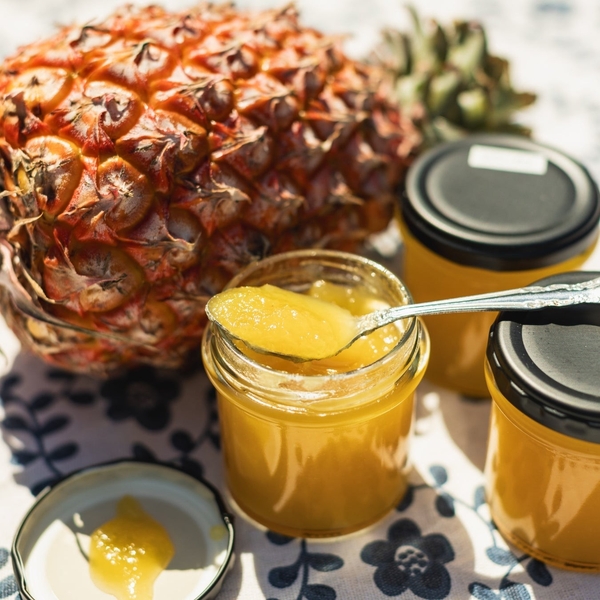品種:ピーチパイン。変形、重さやサイズ不足の規格外品を「ジャム」にしています。原材料はパイナップルとグラニュー糖のみ、添加物は含まず、お子様にも安心。程よい甘さでパイナップルの香りも濃厚です。パンに塗る以外に、炭酸水やホットティーに入れるのもおすすめです。
