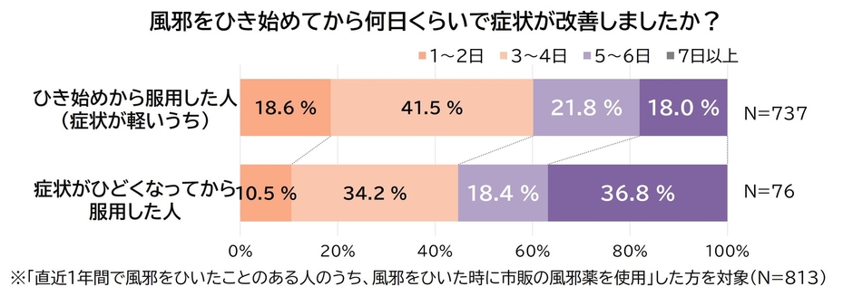 ・ 市販の風邪薬を“風邪のひき始め”に服用した場合、“症状がひどくなってから”服用した場合に比べ、2日以内に症状改善と感じた人の割合が倍近くに。