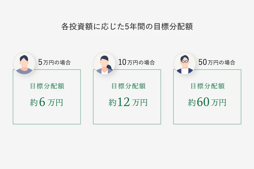 「SOLMINA再エネファンド1号」の目標分配率(合計)は121.22%で設定しており、各投資額に応じた5年間の目標分配額は下図の通りとなります。例えば50万円投資した場合の目標分配額は5年間で約60万円となります。