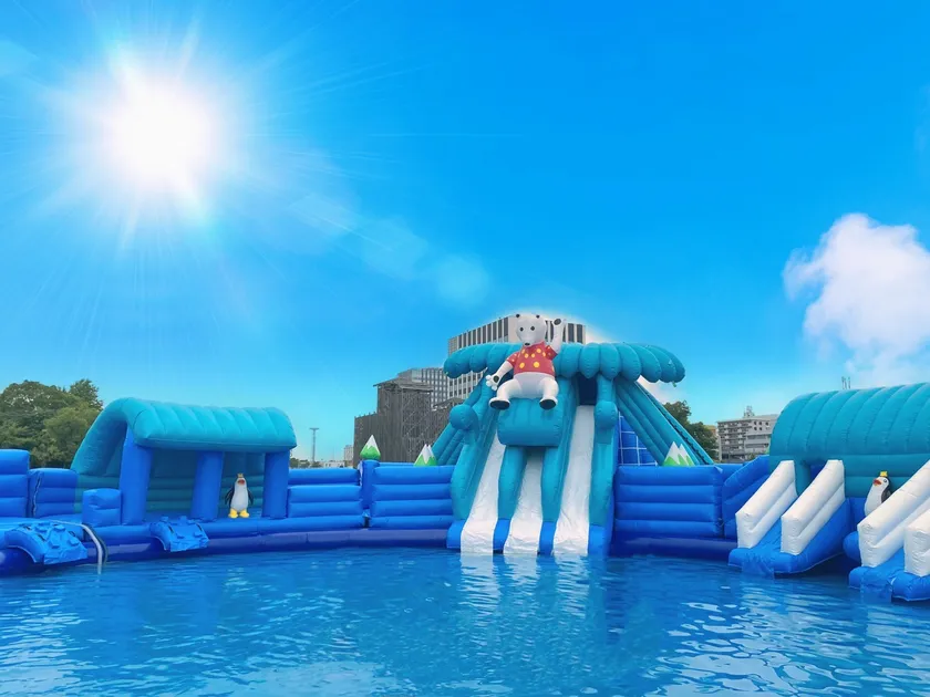 可愛いシロクマが目印のスライダー付き巨大プール。それぞれ20mの広さなので、密になることもなく楽しめます。