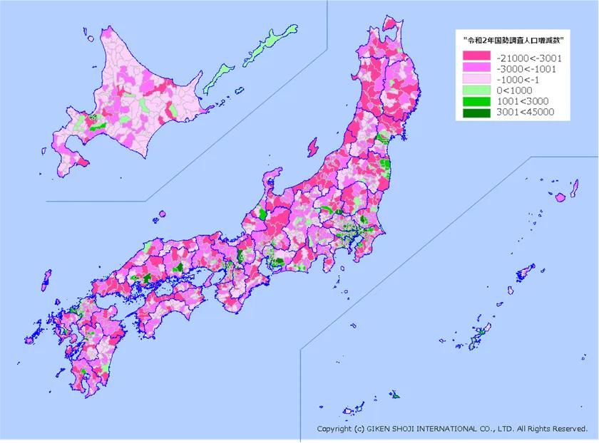 商圏分析・エリアマーケティングGIS(地図情報システム)の開発・販売・運用支援を行う技研商事インターナショナル株式会社(名古屋本社:愛知県名古屋市、東京本社:東京都新宿区、代表取締役:小嶌 智海、以下「当社」)は、6月25日に公表された令和2年国勢調査を市区町村単位で地図上に見える化しました。