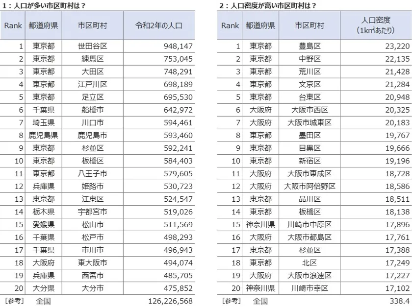 令和2年国勢調査の市区町村単位集計データと当社エリアマーケティング用GIS(地図情報システム)「MarketAnalyzer(TM) 5」を用いて、トップ20ランキングを作成しました。