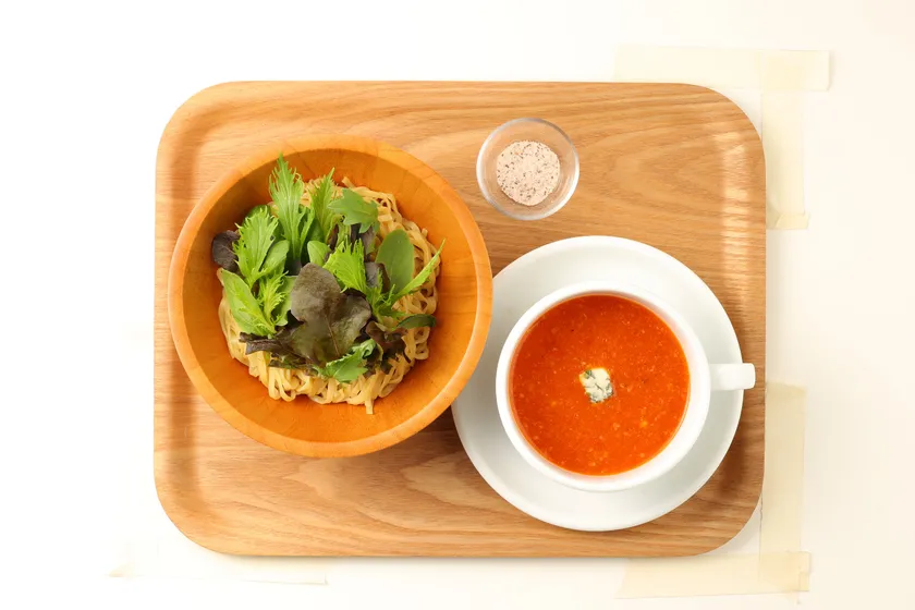 メインメニューのTOMATO(880円)は、イタリア産のトマトを使い、甘みと酸味がちょうど良いスープ(つけダレ)にベビーリーフなどの野菜、彩色ラーメンきんせい提供の平打ち麺がよく絡みます。また、味変はローズソルトがついており、塩味と共にほのかに香る香りの変化も楽しめます。