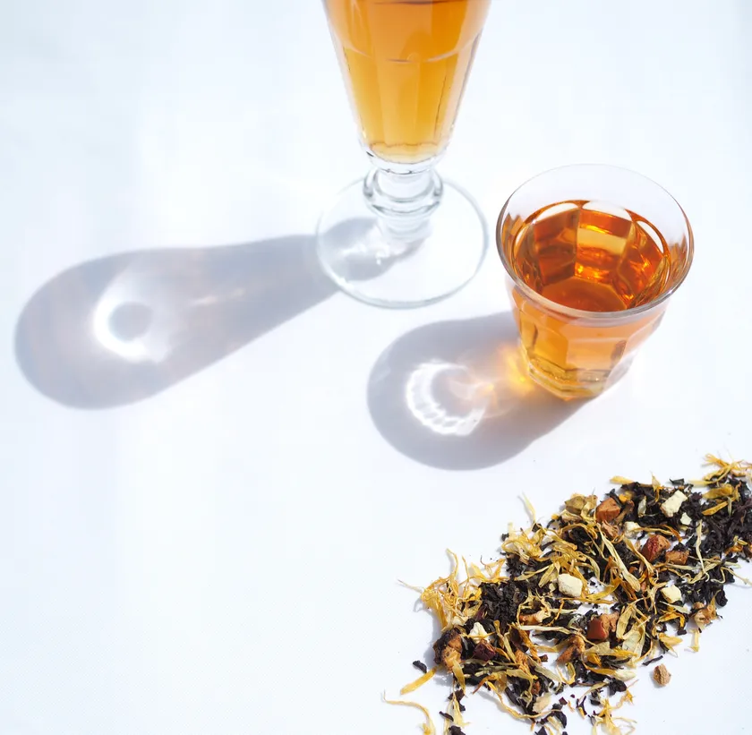 琥珀は「幸運・健康・成功」の意味合いを持つパワーストーンです。茶葉はマリーゴールドやオレンジピールで琥珀を表現し、すい色は明るさと深みのある琥珀色を再現しました。