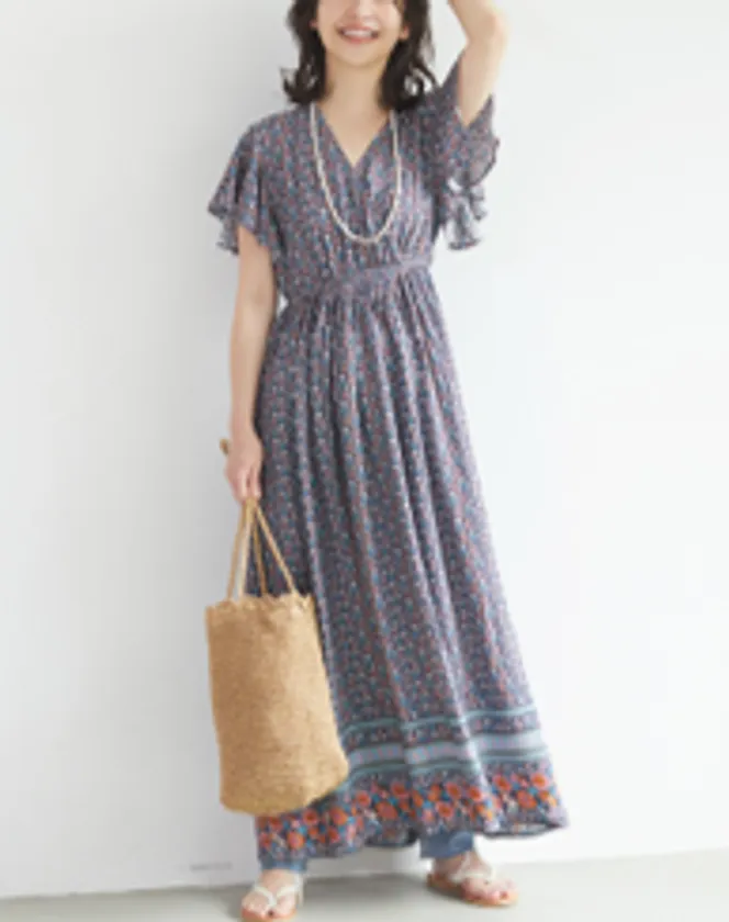 エレガントなフレア袖とやや広めのVネックに加え、裾のクラシカルな花柄プリントが印象的なマキシ丈ワンピース。とろみのあるレーヨン素材がしなやかさとこなれ感をプラスし、全体の小花柄が甘くなり過ぎず幅広い層におススメです。細めのシャーリングをあしらったウエストマークで、メリハリのある女性らしいラインが期待できるのも嬉しいポイント。中に履いたデニムのチラ見せ&ぺたんこサンダルでカジュアルダウンさせても、今っぽさがぐっと増して様になる1枚です。