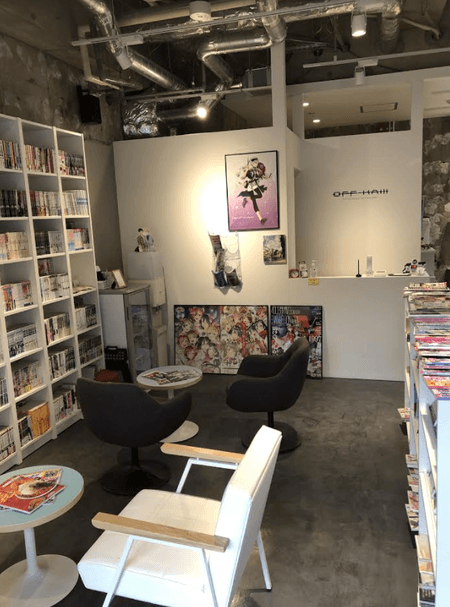 店内には3,000冊にものぼる漫画があり、いろいろなキャラクターのアートパネルが飾られ、アニソンが常に流れています。