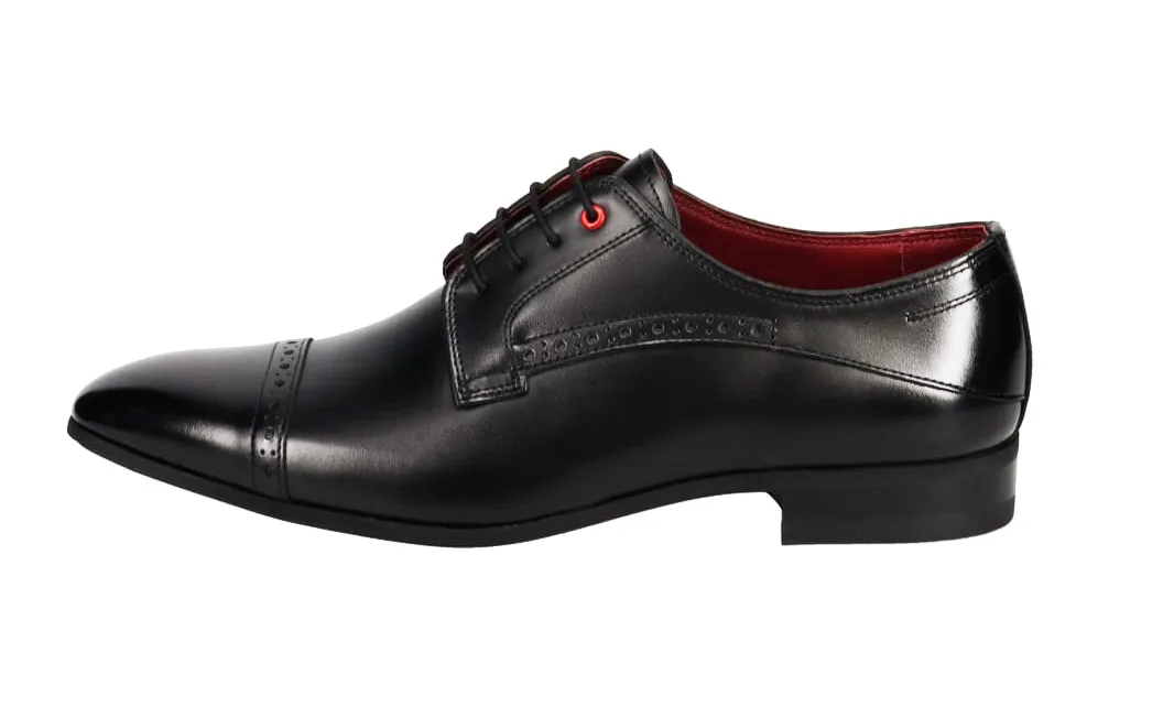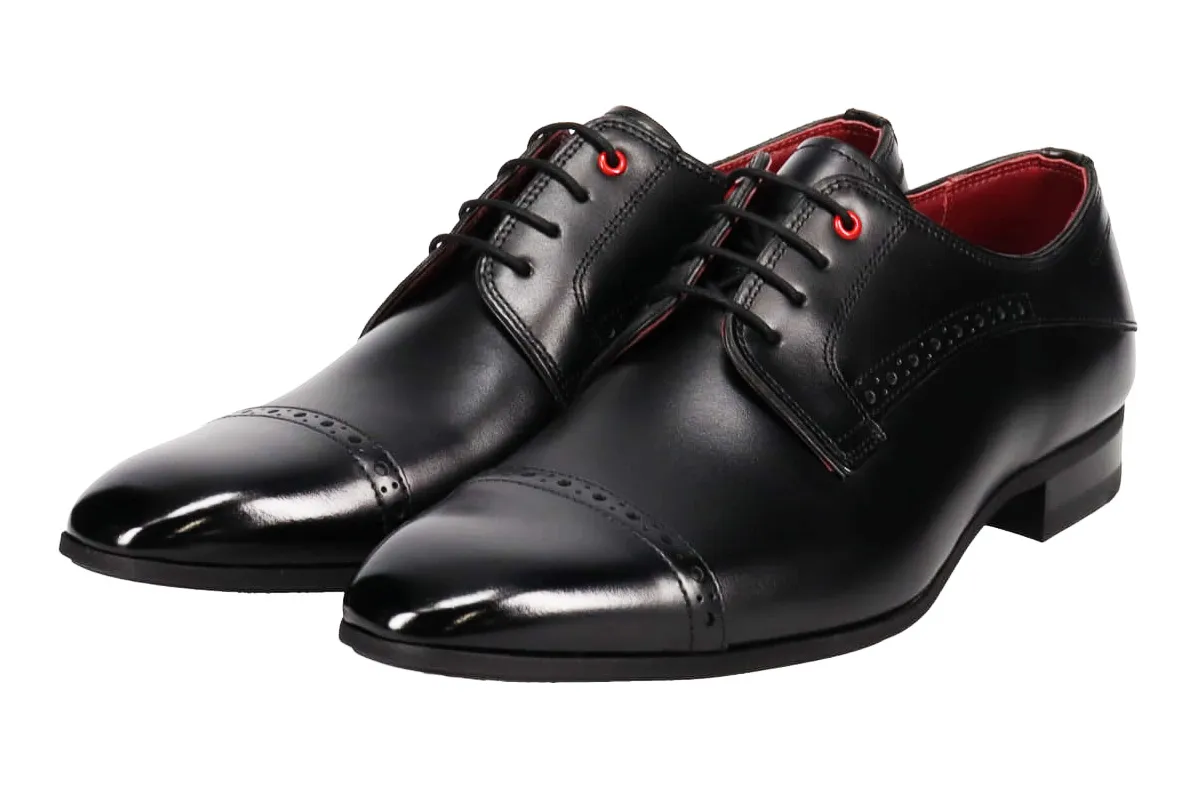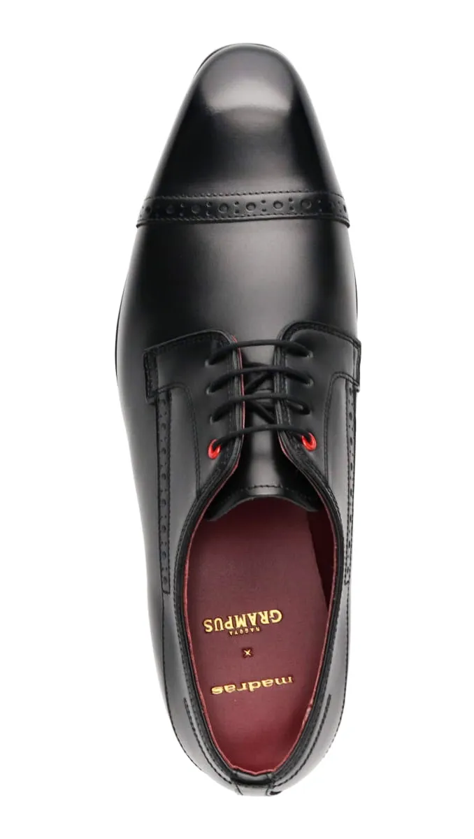 グランパスカラーの赤をハトメ、インソール、アウトステッチ部分にさりげなくあしらったスタイリッシュなダービーセミブローグ。