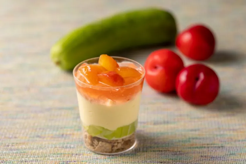 すももと白瓜、それぞれの異なる「甘さ」が相性抜群のデザート。薫り高いすももの甘酸っぱさに白瓜の青っぽい香り&カリっと食感が、バランスよく絡みます。また、濃厚なカスタードはなめらかで、甘さ控えめ。すももと白瓜の美味しさが引き立つよう、生クリームも入れてふわっと柔らかく仕上げています。一番下にはザクザクに砕いた全粒粉クラッカーが敷き詰められており、香ばしいアクセントに。夏にぴったりの、さっぱりした甘さのデザートに仕上げました。