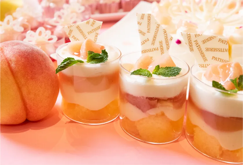見た目もプリンセスな「ピーチドレスカップケーキ」を筆頭に、おいしさだけではなくSNSにあげたくなるような見た目にもこだわりました。その他、旬のピーチをたっぷり使用したコンポートを入れた「ピーチトライフル」や、生地にベビースターを使った「マンゴーベビースタータルト」など、パティシエ手作りのピーチ&マンゴーをふんだんに使った本格スイーツを楽しめます。