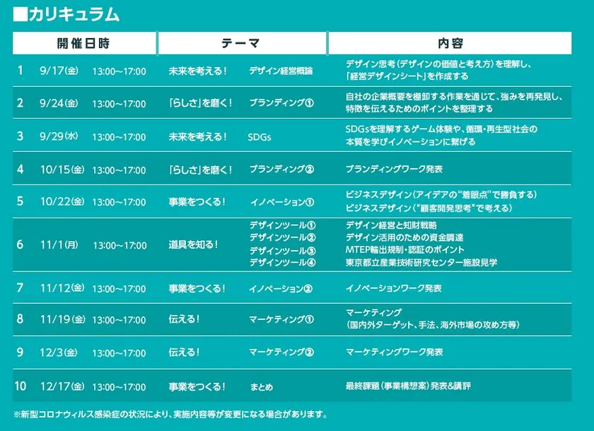 ●全10回の講義とワークを通して、「デザイン経営」を体験できるようプログラムされています。課題のための自主活動(事業所訪問・個別ミーティング等)も推奨しています。