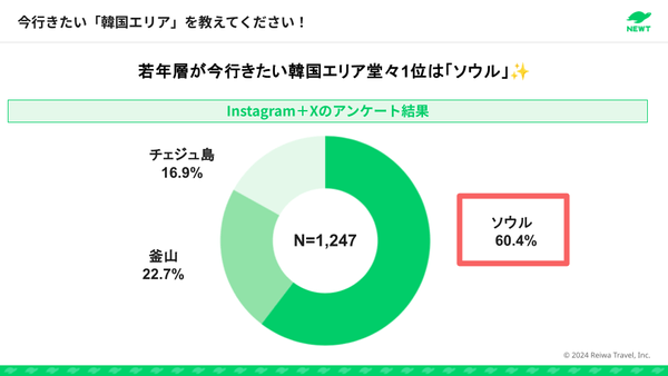 今行きたい韓国のエリアを聞いたところ、「ソウル」(60.4%)が1位に。ソウルは最新トレンドの発信地として、グルメ・ショッピング・美容の最新トレンドが一度に楽しめる王道の街としての地位を確立しています。