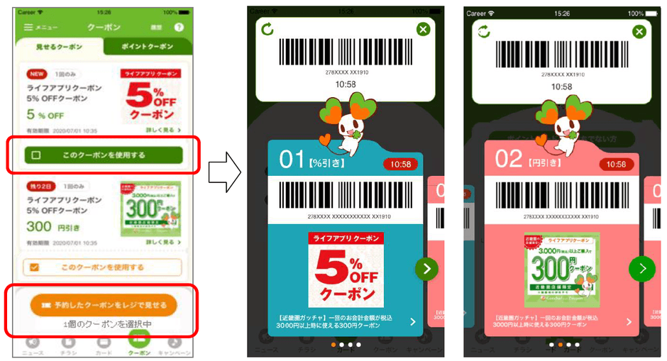 利用するクーポンをライフアプリから選択し、「予約したクーポンをレジで見せる」をタップするとバーコードが表示されます。各クーポンのバーコードをスキャンします。