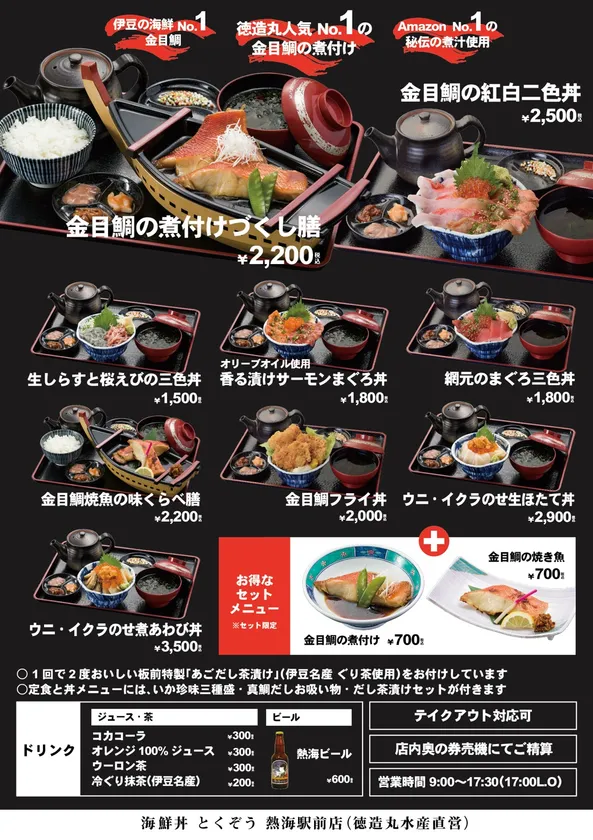 海鮮丼とくぞう熱海駅前店では、伊豆名産で祝い魚の「金目鯛」を中心に海鮮丼や定食を提供。